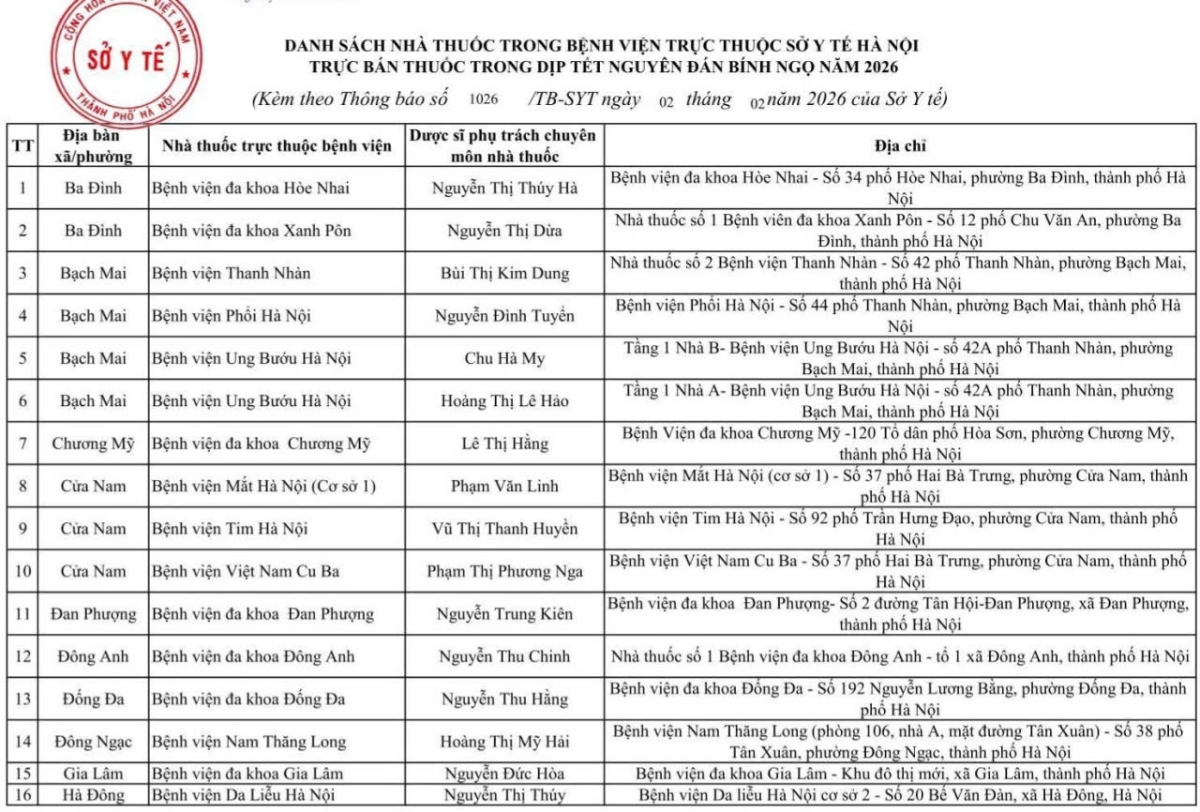 Theo danh sách, có 40 nhà thuốc trong bệnh viện trực thuộc Sở Y tế và 194 nhà thuốc tư nhân trên toàn thành phố trực bán thuốc trong dịp Tết Nguyên đán Bính Ngọ 2026.