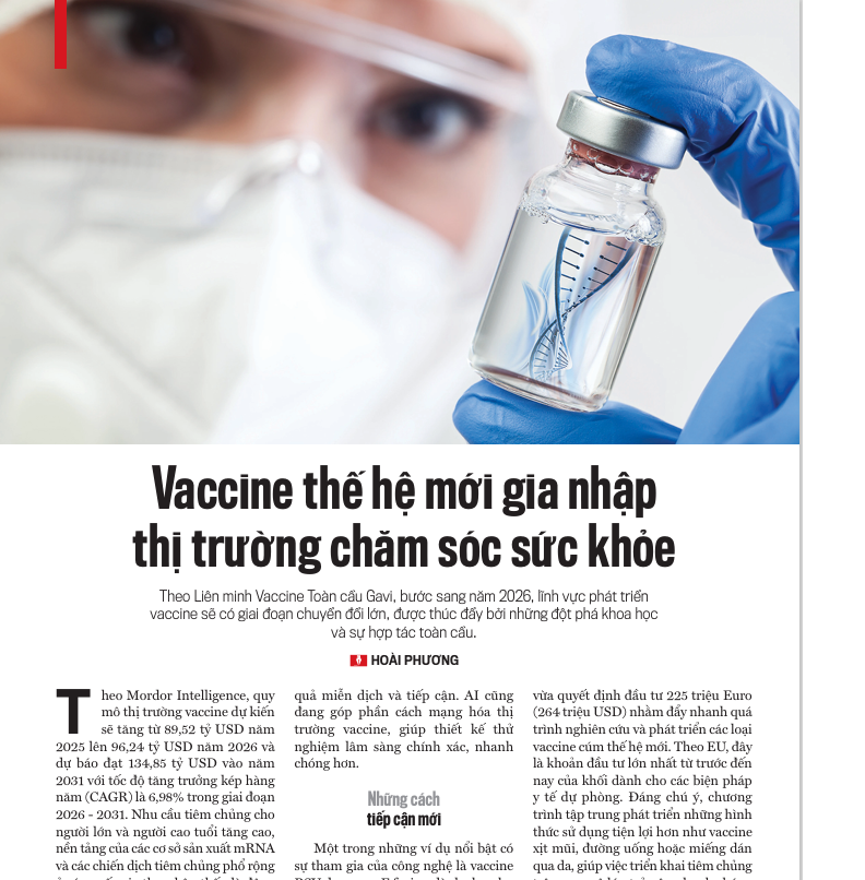 Vaccine thế hệ mới đang tạo ra những bước đột phá đáng kể trong lĩnh vực chăm sóc sức khỏe toàn cầu. Theo Mordor Intelligence, quy mô thị trường vaccine dự kiến sẽ tăng từ 89,52 tỷ USD năm 2025 lên 96,24 tỷ USD năm 2026 và có thể đạt 134,85 tỷ USD vào năm 2031. Tốc độ tăng trưởng kép hàng năm (CAGR) là 6,98% trong giai đoạn 2026 – 2031.